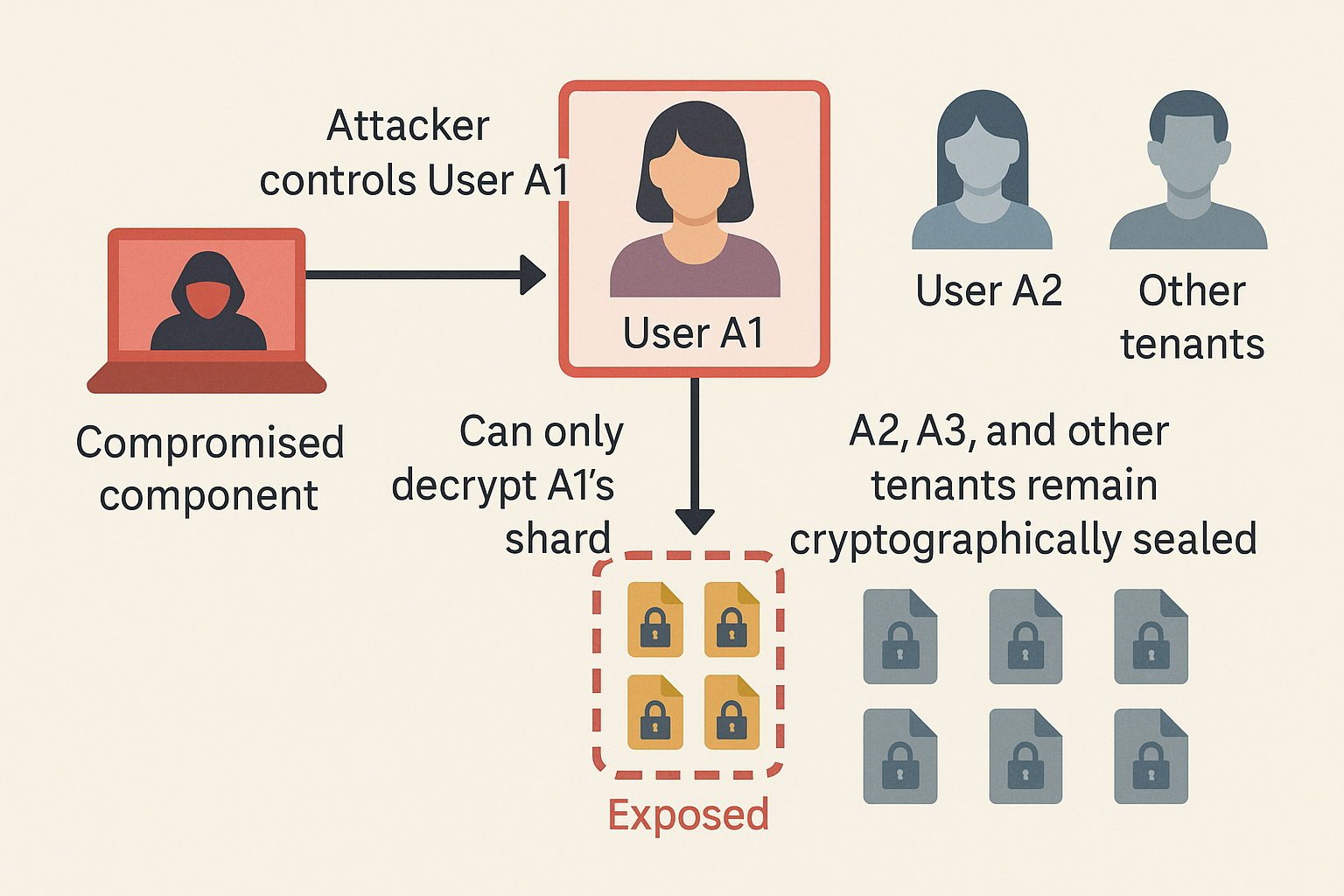 This is the practical expression of structural sharding: even inside a single tenant, one user’s key material is insufficient to unlock another user’s data, and a compromised process operating on behalf of that user is equally constrained.